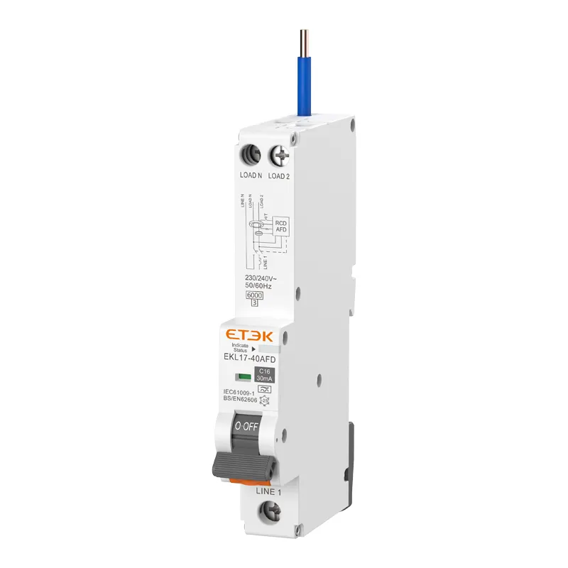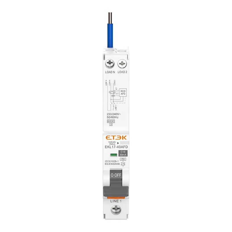 EKL17-40AFD-Geräte sind Einzelmodulgeräte, die in das vorhandene Sammelschienensystem der bestehenden Anordnung passen. Das Gerät bietet Schutz gegen Überstrom, Kurzschluss, Erdschluss und Lichtbogenfehler in einem Gerät und ist in den Kurvenvarianten B und C erhältlich. Es kann RCBO in vorhandenen Verbrauchereinheiten direkt ersetzen.