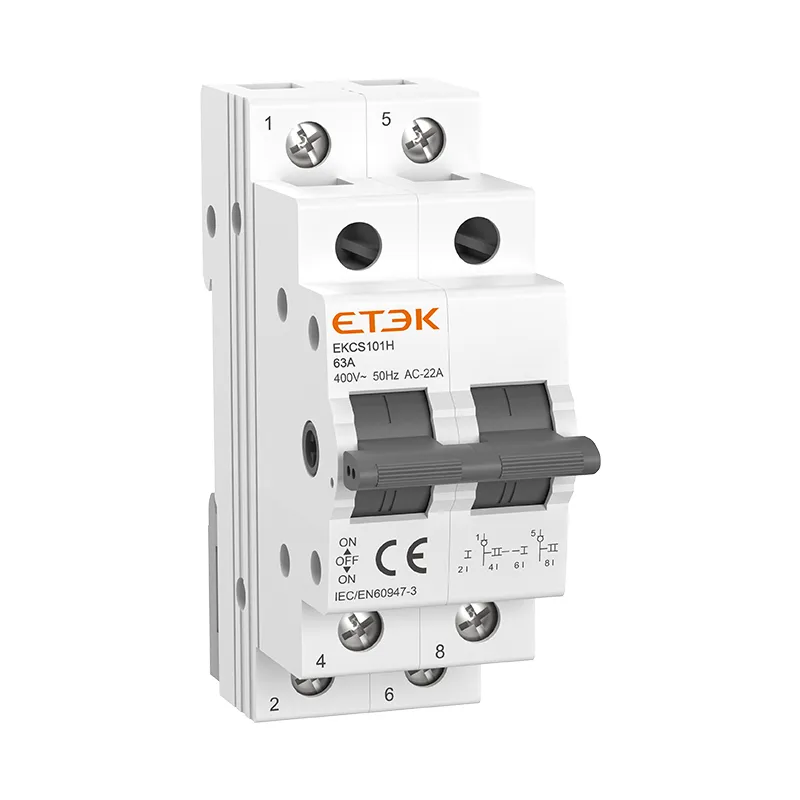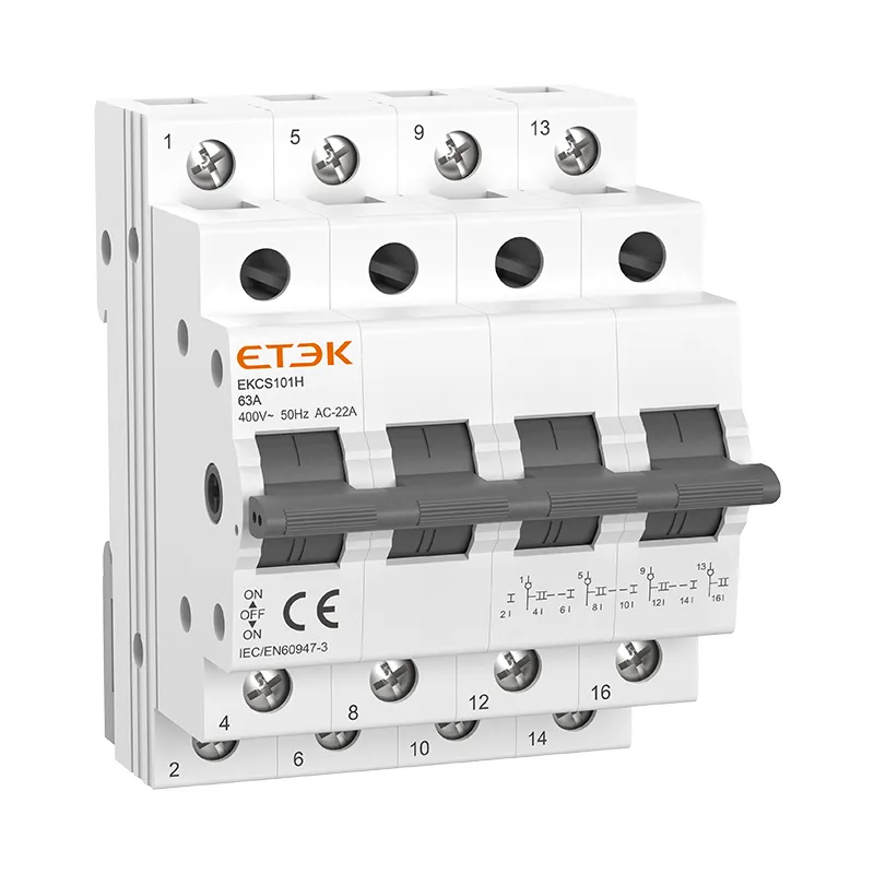 Der MCB-Umschalter ETEK EKCS101H ist ein manuell betätigter Schalter, der zum Umschalten der Last zwischen zwei Stromversorgungen verwendet wird. Dieses Gerät kann einen maximalen Betriebsstrom von 63 Ampere erreichen. Es wird häufig in der Industrie sowie im Privatbereich verwendet, insbesondere in einzelnen Bungalows zur Verwendung in Niederspannungsverteilungskreisen. Der Zweck des Schalters besteht darin, bei einem Stromausfall Strom vom kommerziellen Stromnetz auf einen lokalen Generator zu übertragen. Er wird auch als Transferschalter bezeichnet.