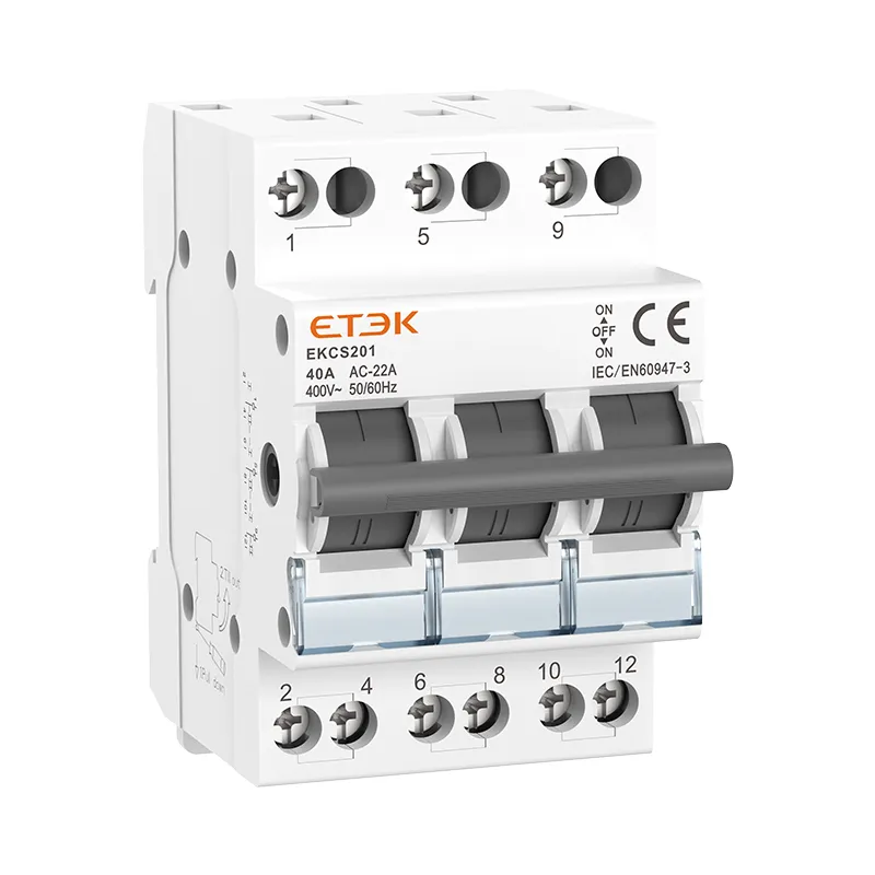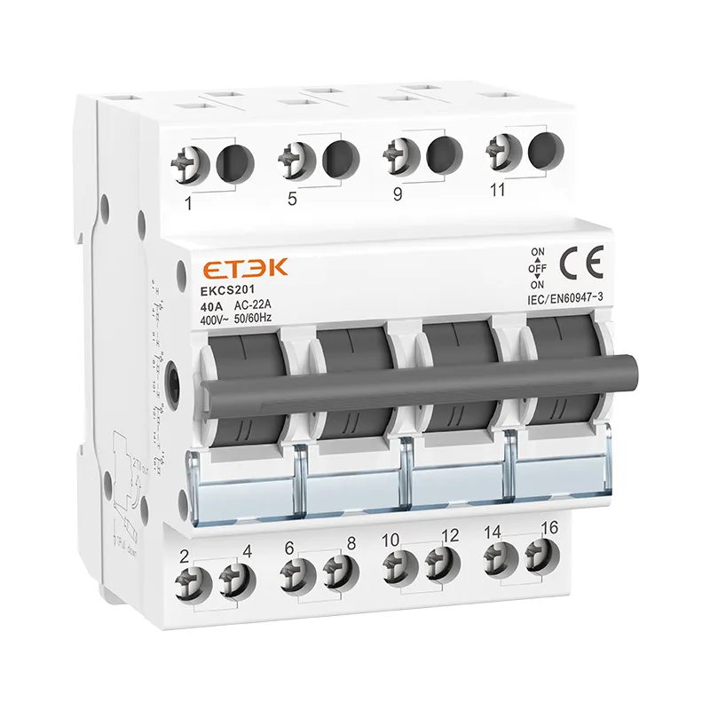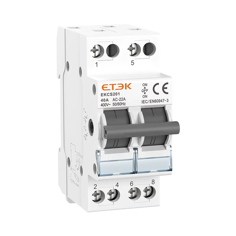 Der schienenmontierte Trennschalter EKCS201 mit doppelter Stromumwandlung hat vier Funktionen: Ein, Aus, Umwandlung und Isolierung. Er kann zwischen zwei Lasten, die von einer Gruppe von Leitungen getragen werden, oder zwischen zwei Stromquellen frei ein- und ausgeschaltet werden. Er wird zum Ein- und Ausschalten und zur Installation auf einer DIN-Standardschiene (35 × 7,5) verwendet. Das Gehäuse besteht aus PA66-Spritzguss und ist hochflammhemmend. Er ist ein ideales Produkt zum Schalten und Öffnen und Schließen in industriellen Geräten und Schaltkreisen. Der maximale Strom kann 40 A erreichen und er lässt sich bequem und sicher auf der Führungsschiene installieren und verdrahten.