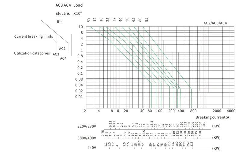 | Elektrische Lebensdauer (x103 Schaltvorgänge) | AC-4 | 200 | 200 | 200 | 200 | 200 | 150 | 150 | 150 | 100 | 100 |