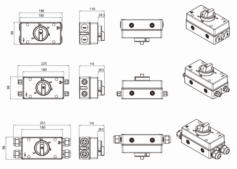 | EKD6-EL32R-2H | DC-Isolator mit Box IP65 4P 32A 4Serien /1Strings Verbindung von oben nach unten |