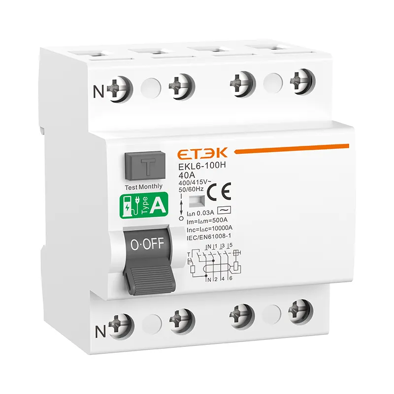 EKL6-100H Fehlerstromschutzschalter vom Typ A, geeignet für den Erdschlussschutz eines 16–100 A Wechselstrom-Verteilungssystems, großer Anschlussanschluss 35 mm², beide Seiten können Stift- oder Gabelsammelschienen verwenden; Hohe Sicherheitsleistung, über 30 mA Strom und Stromausfall in 3 Millisekunden; Alle Teile und Komponenten wurden unabhängig entwickelt und unabhängig produziert.