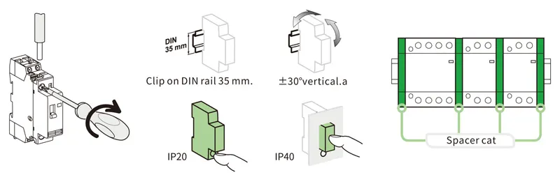 | Hinweis: Bei der Schützmontage in einem Gehäuse, dessen Innentemperatur im Bereich zwischen 50 °C und 60 °C liegt, muss zwischen jedem Schütz ein Abstandshalter verwendet werden. | ||