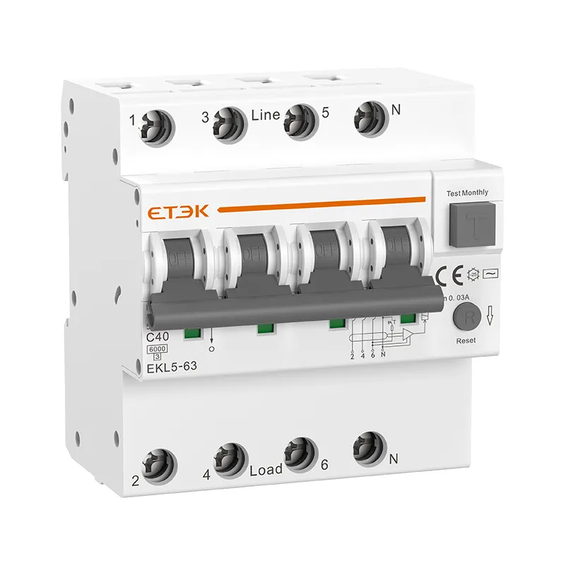 Fehlerstrom-Schutzschalter mit Überstromschutzbereich der Serie EKL5-63 bieten umfassenden Schutz für Personen und Elektrogeräte, da sie so konzipiert sind, dass sie im Falle einer Überlastung, eines Kurzschlusses oder eines Erdschlusses die Stromversorgung automatisch unterbrechen.