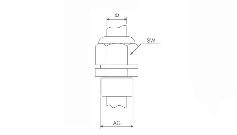 | Modell | Gewindegröße (mm) | Lochgröße AG (mm) | Gewindelänge (mm) | Wandstärke (mm) | Verwendbares Kabel Ф (mm) | Schlüsselweite SW (mm) |